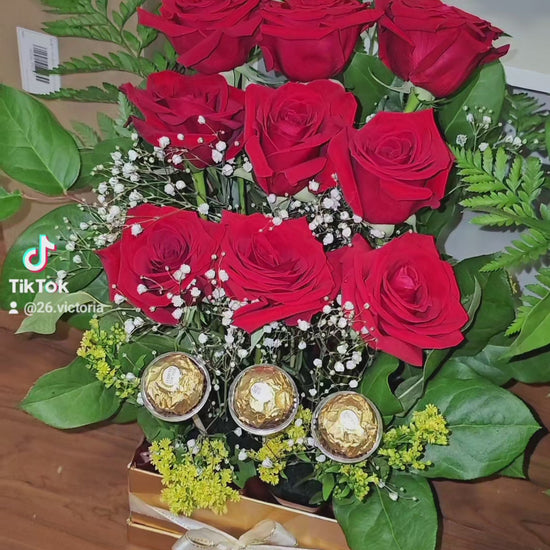 Un hermoso arreglo de rosas rojas frescas con hojas decorativas naturales, acompañado de deliciosos chocolates. La combinación perfecta para expresar amor de manera especial.