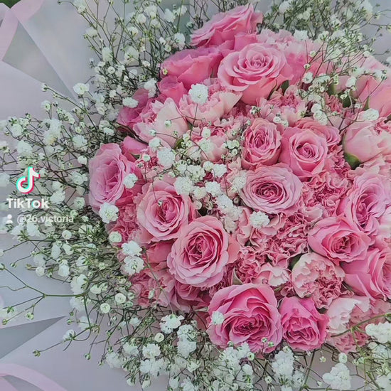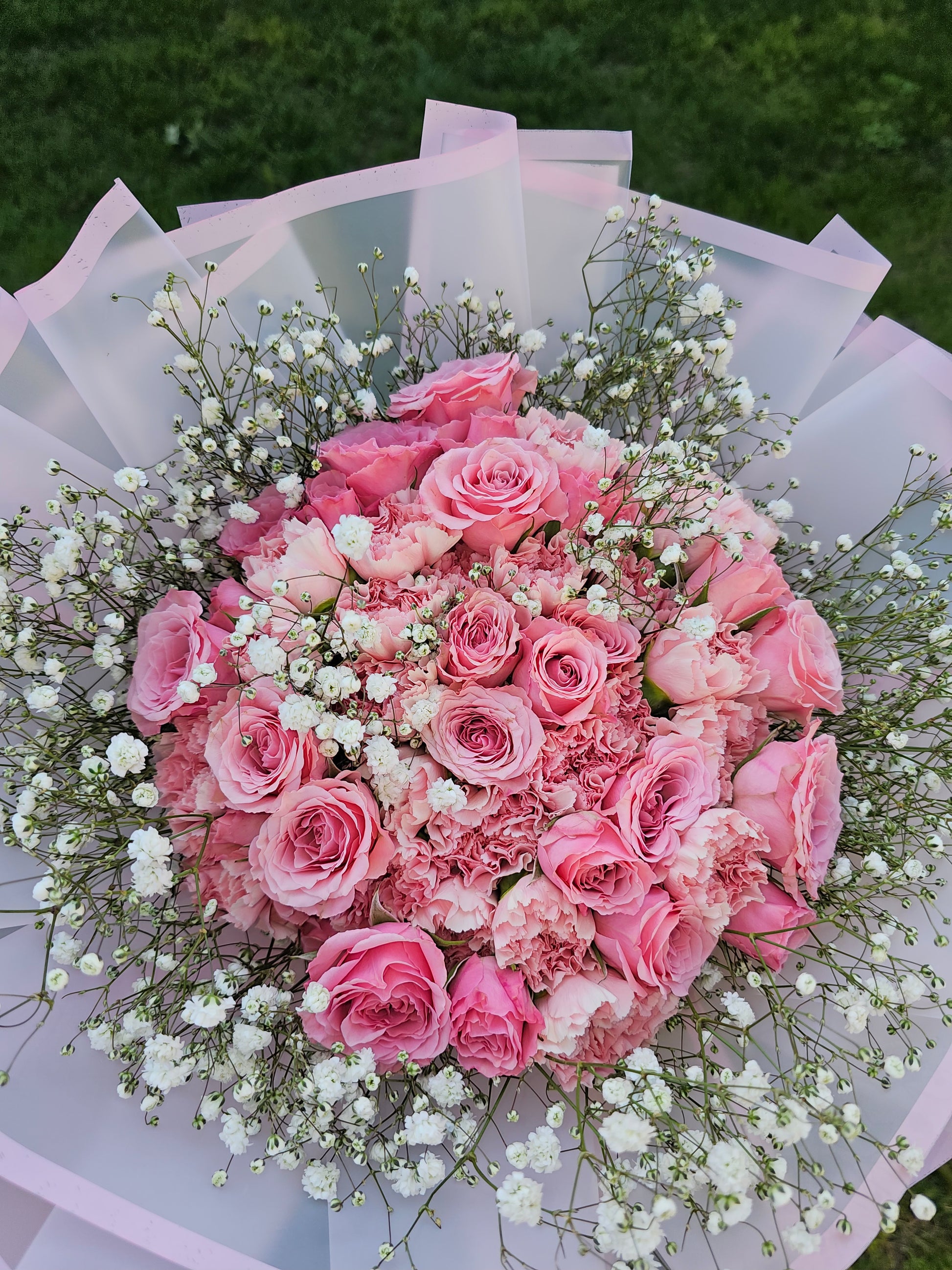 Belleza que dura más tiempo - Combinación perfecta de claveles y rosas rosadas para un ramo de larga duración.