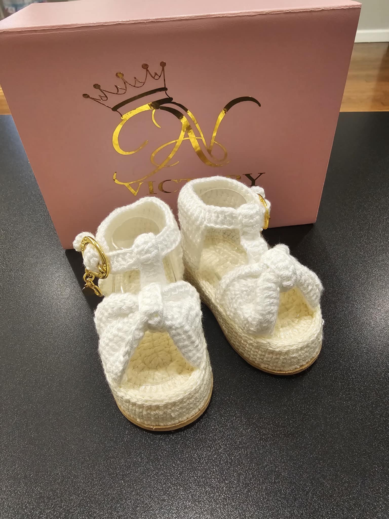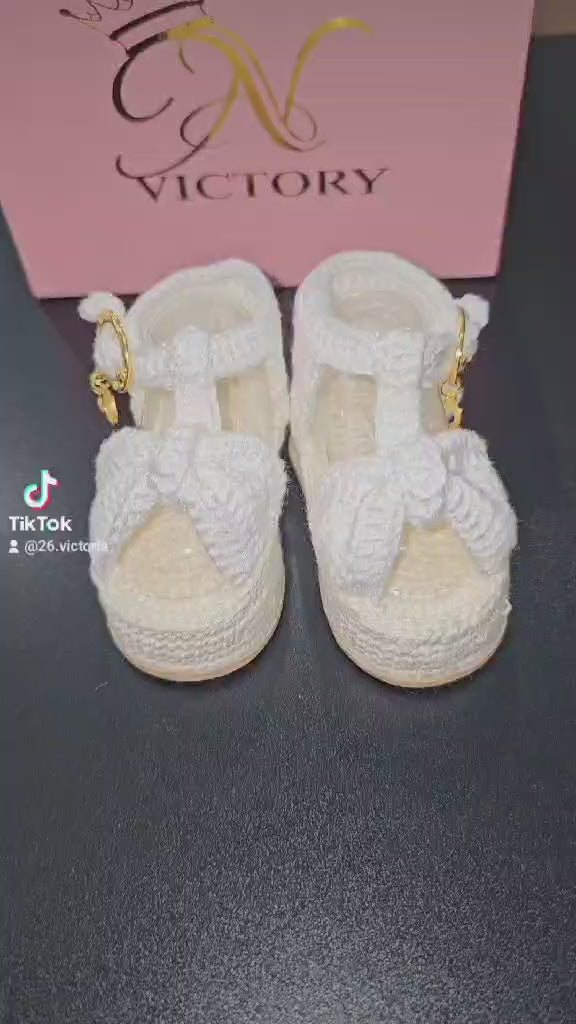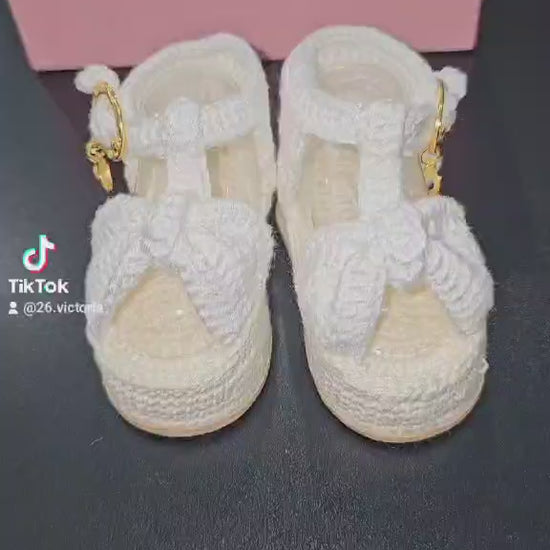 Hermosas sandalias de plataforma tejidas a mano con mucho amor y paciencia, especiales para bebé de 0 a 3 meses. Tejidas con hilo suave especial para los delicados piecitos de nuestros consentidos de casa.